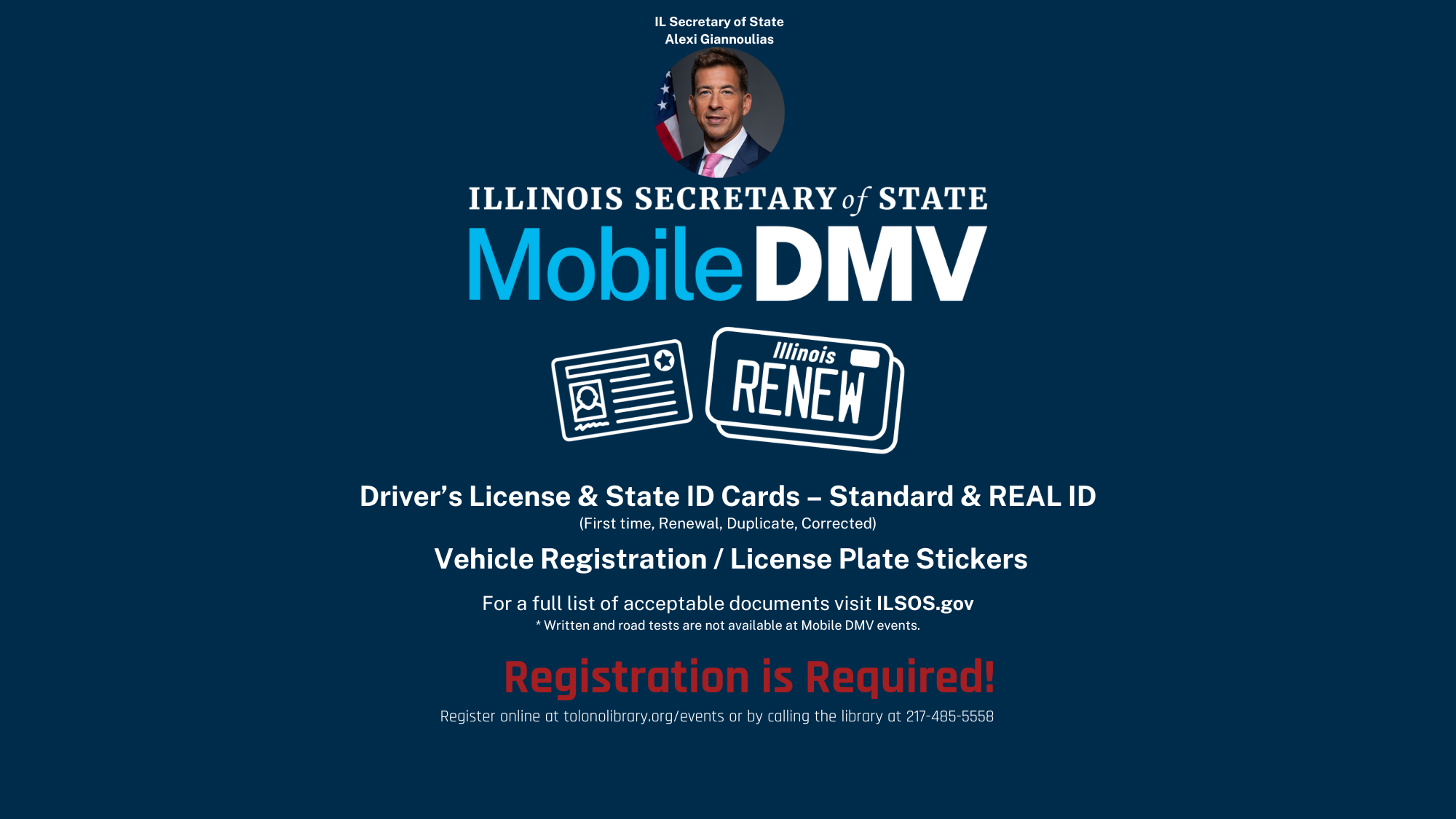 Save yourself a trip to the DMV by coming to the Library instead. Register for your timeslot!